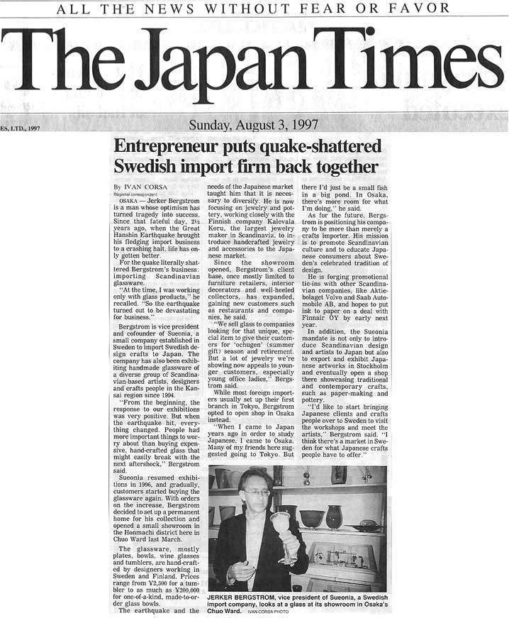 設立当初は、大阪の本町に事務所兼、販売店を構えておりました。店内は、スウェーデンの白樺の家具を基調に整え、口で吹いて作られた スウェーデン最高品のグラスや、スウェーデンの最も優れた金・銀細工師による宝石類(30から40個)を販売しておりました。 しかし、1995年1月の神戸の悲劇により、状況が一変してしまいました。詳しくは、The Japan Timesの記事をご覧下さい。